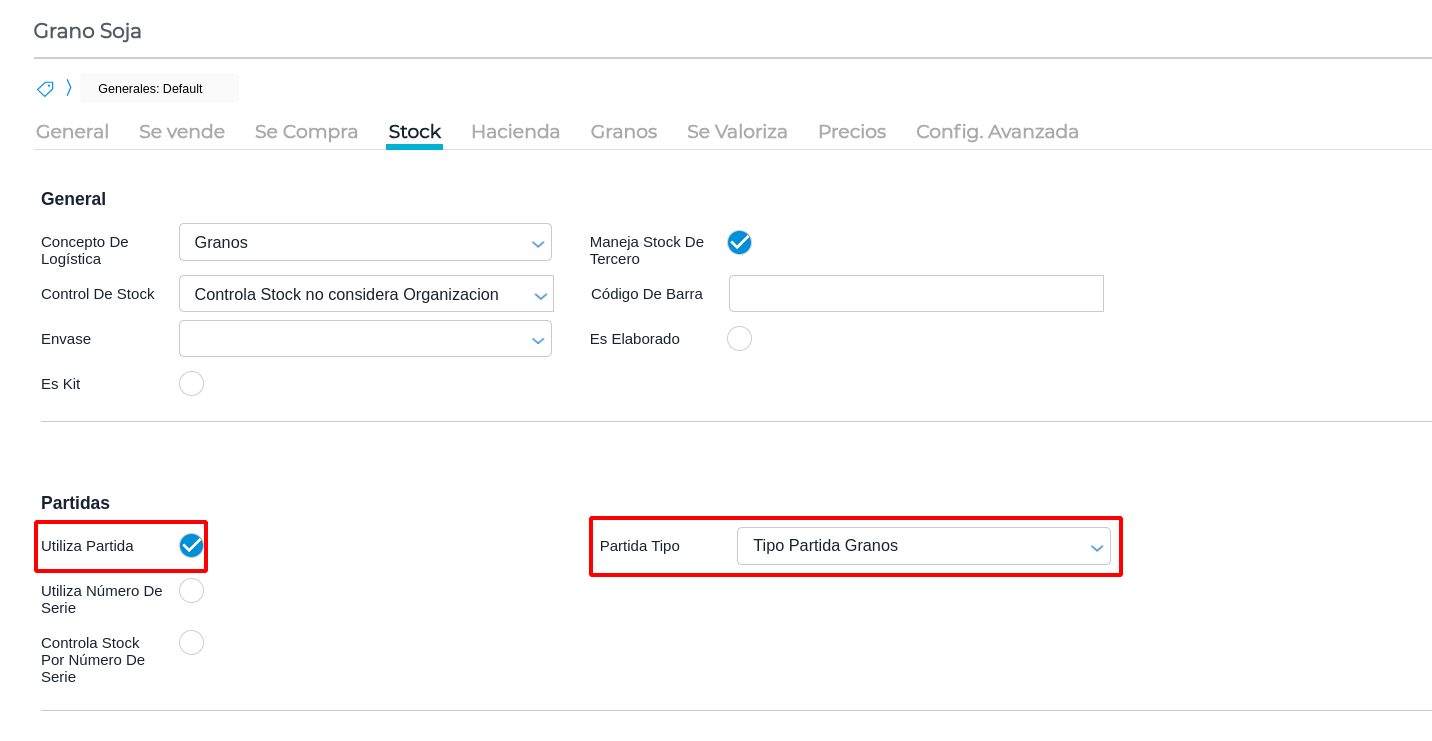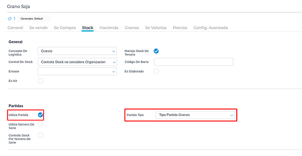 - Por default vienen configurados para manejar Partida Tipo Granos; esto implica que cada vez que se mueva stock del producto va a exigir que se le indique la partida. Las partidas en Agro son las campañas agrícolas (por ejemplo, “Campaña 25-26”). Esta configuración es importante mantener para tener separados los stocks de grano por campaña de cosecha: