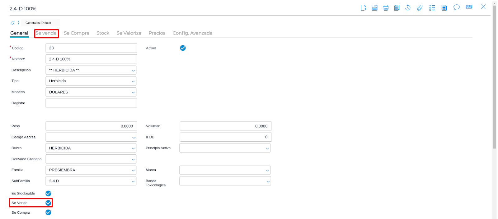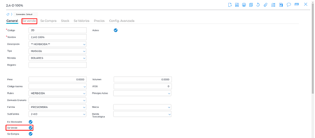 - Los productos que son stockeables, vienen configurados por default para “compras”. En caso de que el cliente venda insumos agrícolas o de cualquier tipo, tiene que tildar la opción “Se Vende” para poder configurar cuenta, concepto y tasa impositiva de VENTA:
