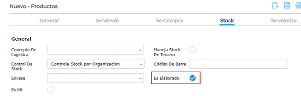 En el caso de productos elaborados (vertical de manufactura), se debe agregar en el maestro de productos el tilde de “es elaborado” dentro de la pestaña “Stock”.