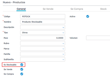 Los productos pueden crearse de manera manual o mediante un archivo de importación. Para gestionar el stock de un producto, hay que tildar la opción “es stockeable” dentro de la solapa “general” del mismo.