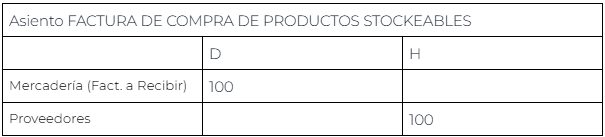 Importante: Cuando se registra una factura de compra de productos stockeables, el sistema contabiliza dicho comprobante en las cuentas “Factura a recibir” (esta se trata de una cuenta puente, regularizadora del ACTIVO).