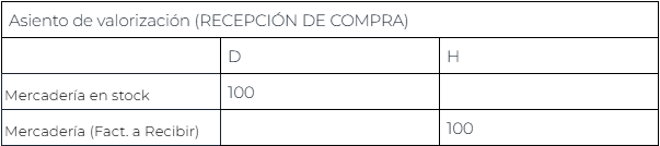 Posteriormente, cuando se valoriza el stock mediante el proceso de valorización de stock, la Recepción de Compra -documento asociado a la factura, que genera el ingreso del stock al sistema-, el sistema revierte el saldo de esa cuenta, dejándolo en “0”, contra las cuentas “Mercaderías en stock”.