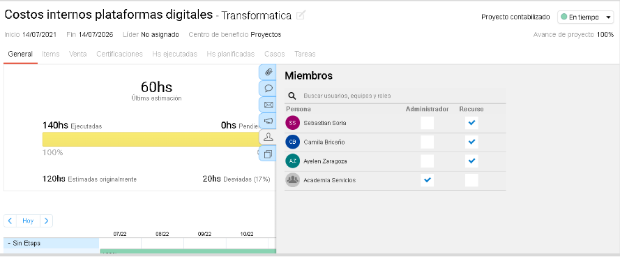 Servicios, tiene la funcionalidad de carga de horas para que puedas controlar el avance planificado y real de tus proyectos. Además, posteriormente, puedes realizar el costeo de estas horas.