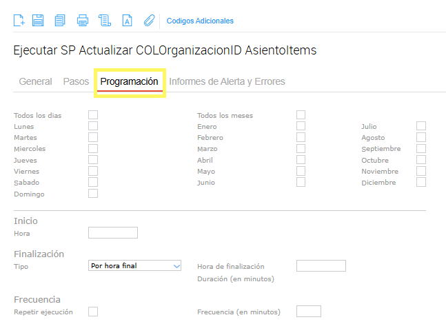 Desde la pestaña Programación se indican los días y horario en que debe ejecutarse.