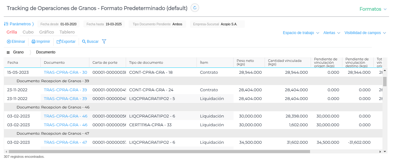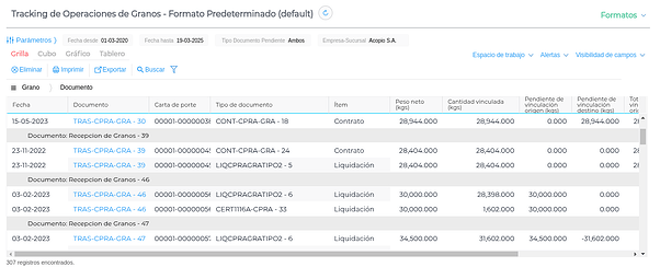 Este informe permite visualizar en un único reporte la vinculación de todos los traslados de granos, respecto de contratos y liquidaciones. Muestra tanto cantidades vinculadas, como pendientes de vincular.. Es útil cuando se necesita identificar de manera rápida si los documentos de recepción de granos y traslados de venta de granos tienen pendiente o no de vinculación en origen (contrato) y destino (liquidación).