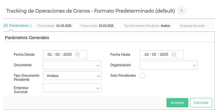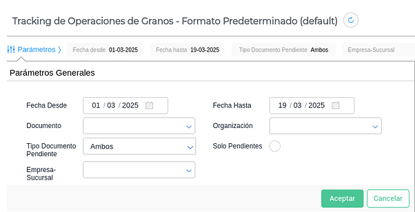 - Documento: permite filtrar por tipo de documento de traslado de granos.