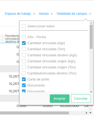 Pendiente de Vinculación Destino (kgs): pendiente de vincular a la liquidación (en el caso que esta se encuentre vinculado parcial o no vinculado).