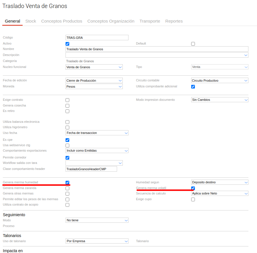 - Ir a App Builder - Documentos - Tipos de Documentos - Traslado Venta de Granos y verificar que los checks “Genera merma humedad” y “Genera merma volátil” estén tildados.