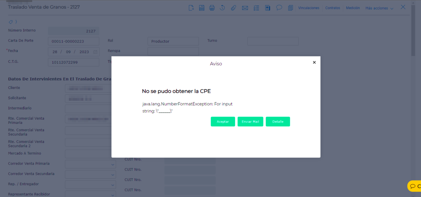 Al querer obtener CPE en un traslado de venta de granos, surge el siguiente aviso: