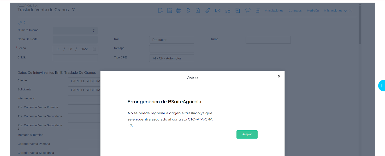 En un traslado de venta de granos se intenta realizar un “Regreso a Origen” pero al momento de hacerlo el sistema arroja el siguiente mensaje: