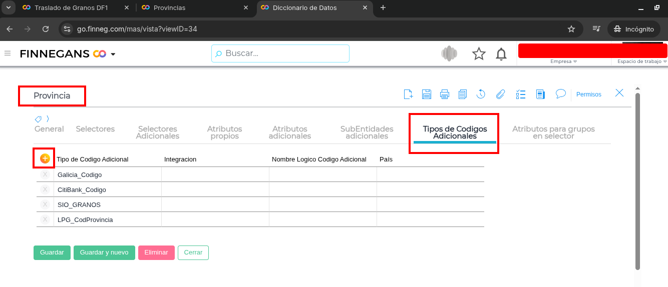 - Dentro de la solapa “Códigos adicionales”, corroborar que aparezca el código agregado (LPG_CodProvincia).