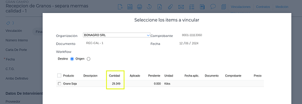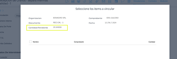- Desde el botón “Vinculaciones” se puede observar que la cantidad pendiente es el “Peso Seco y limpio”