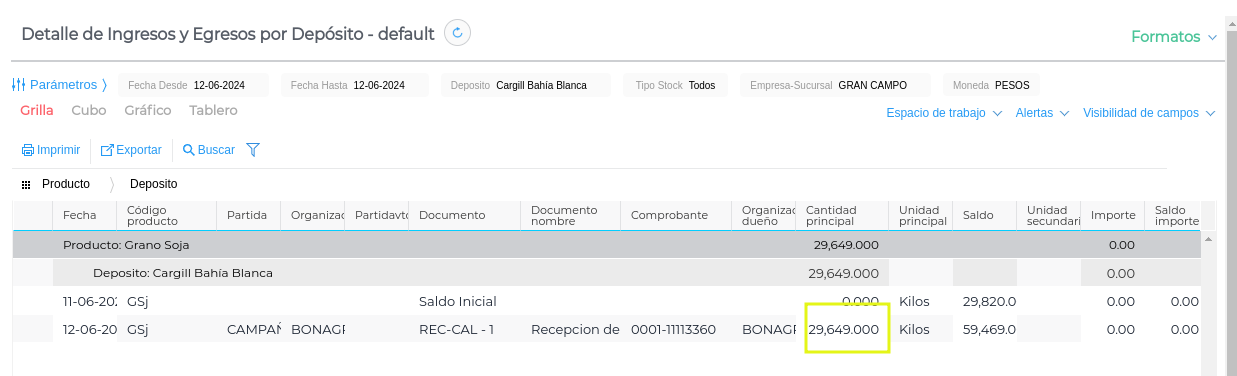 Desde esta grilla se podrá controlar el impacto de stock. Como se observa, el peso Neto es el que genera el impacto en el depósito detallado en el traslado.