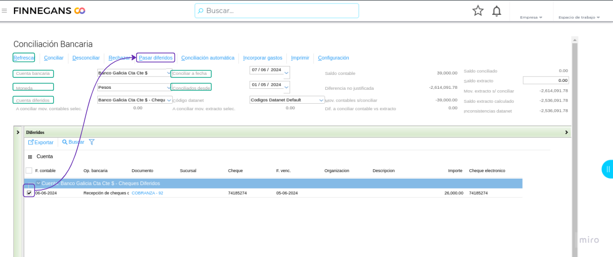 Hacer click en “Refrescar” y seleccionar el cheque y hacer clic en “Pasar diferidos”:
