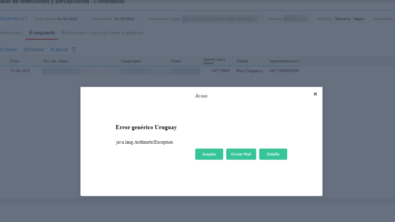 Los e-resguardos en el sistema son ordenes de pago que tiene retenciones. El error se debe a que no se indico el ISAR (base imponible de la retenciones) en la solapa retenciones de la orden de pago.