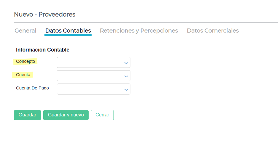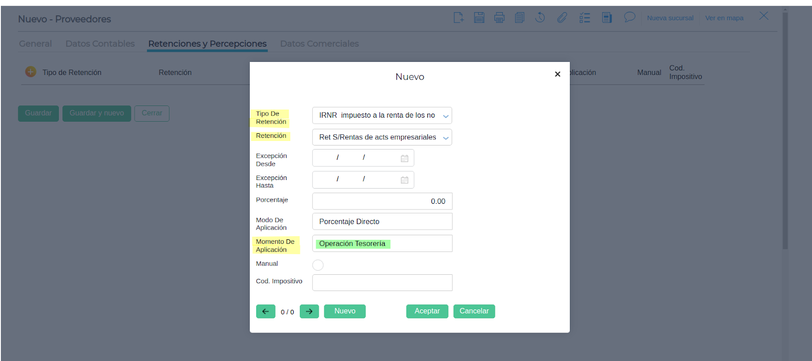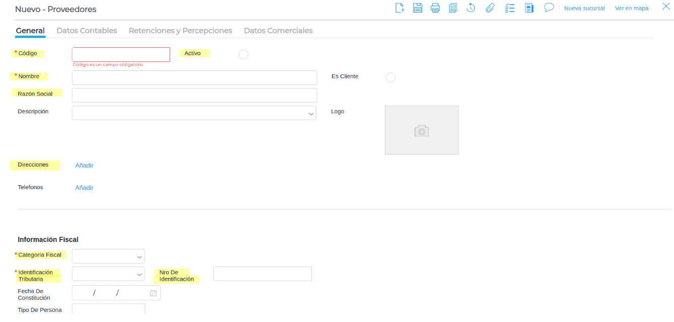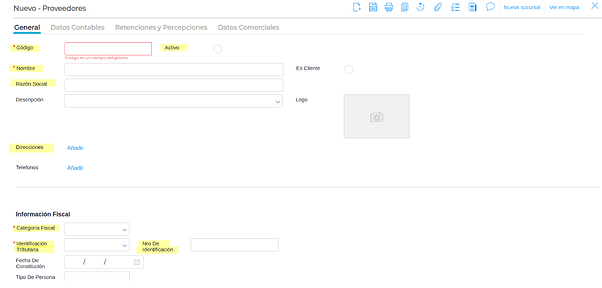 Para poder cargar un nuevo proveedor al cual se le debe aplicar retenciones y emitir un e-resguardo se debe completar los siguientes campos.