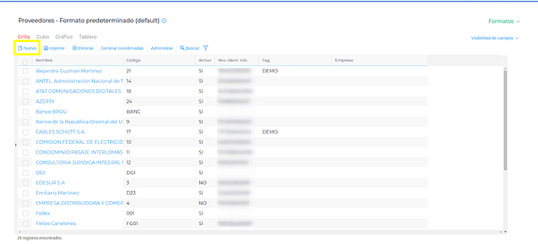 Menu→ Gestión empresarial → Compras → Maestros → Proveedores
