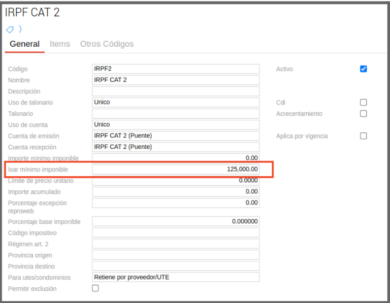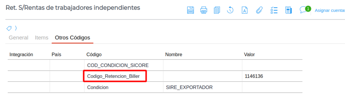 Se debe indicar el valor 1 para dicho código, de esta manera el sistema actualizará los campos de la retención en base a la cotización actual.