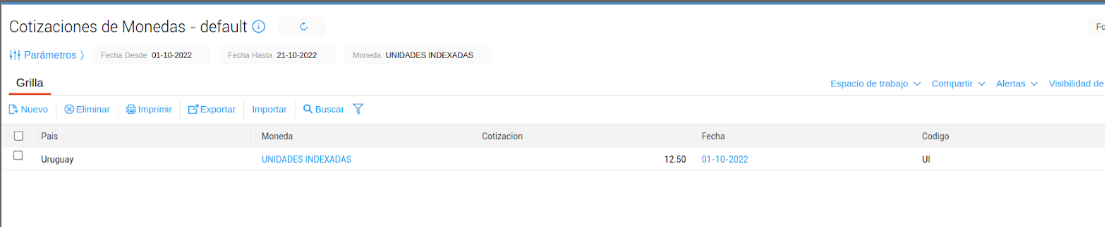 En el maestro de Cotizaciones de Monedas, indicar la cotización de la moneda UNIDADES INDEXADAS.