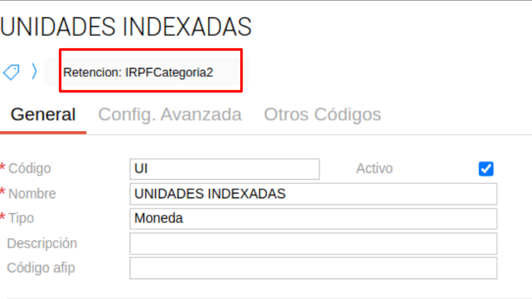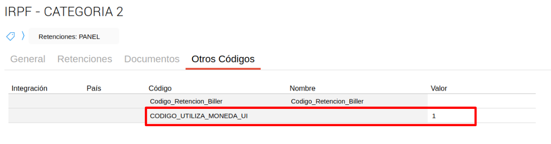 En el maestro de Tipo de retenciones, en la solapa Otros Códigos, se encuentra el código adicional CODIGO_UTILIZA_MONEDA_UI.