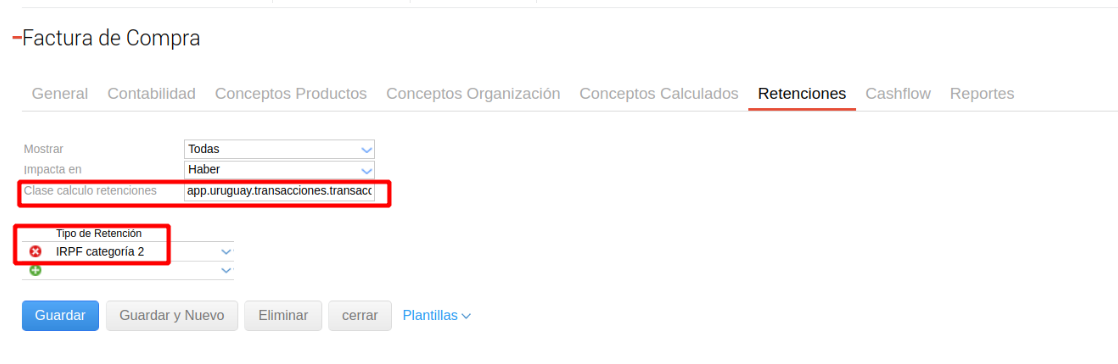 En el campo Clase calculo Retenciones se debe indicar: app.uruguay.transacciones.transaccionUruguay.impuestos.retenciones.CalculoRetencionesUruguay
