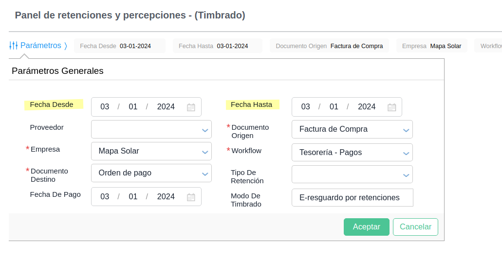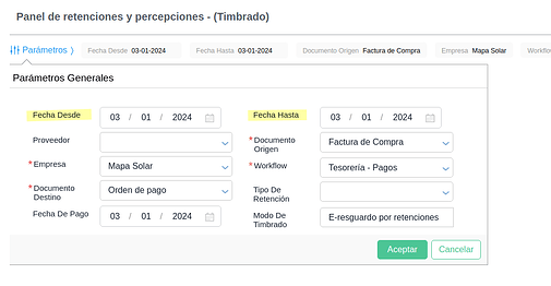 Ingresar a la vista Panel de retenciones y percepciones y completar los siguientes parámetros