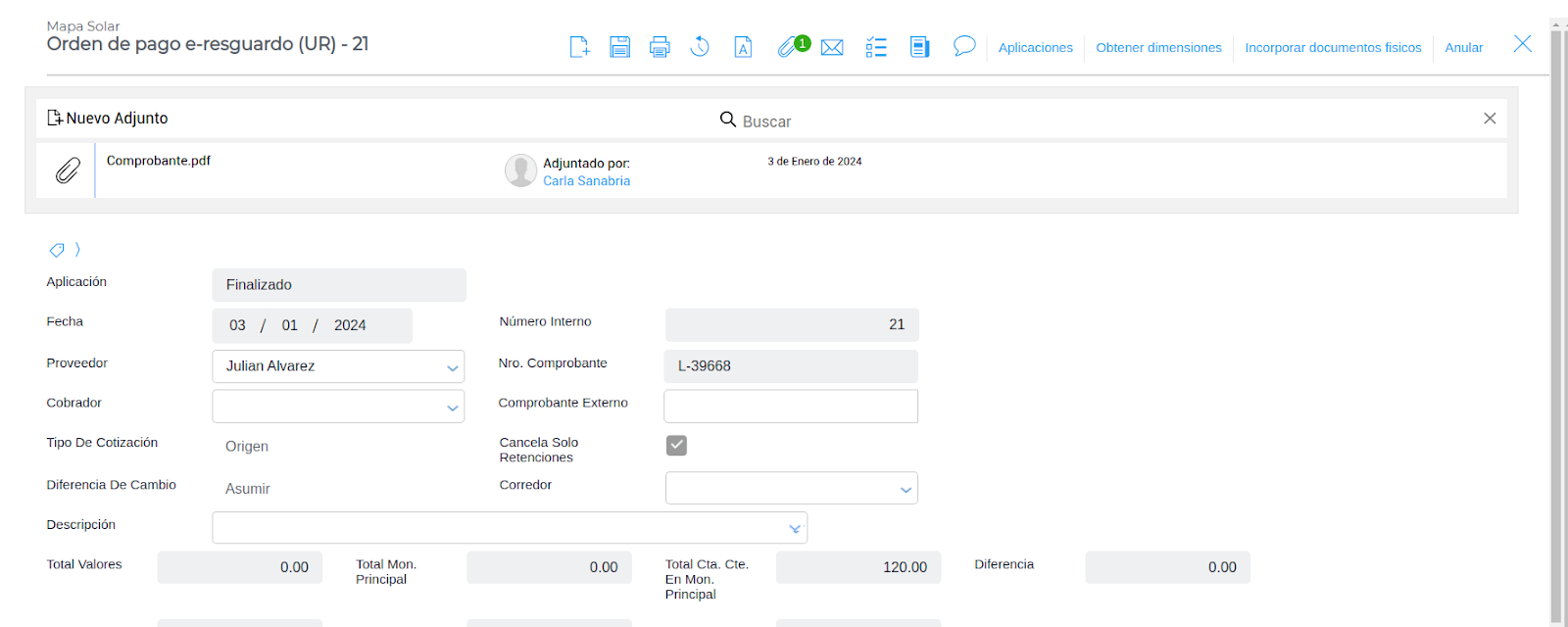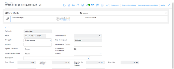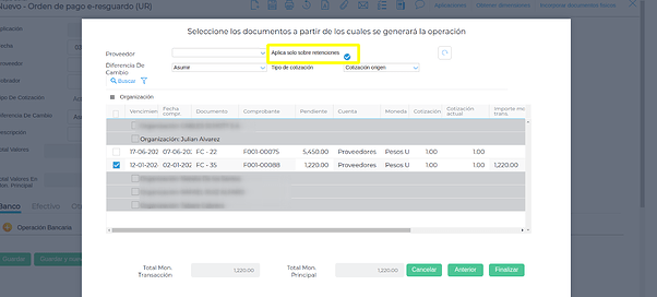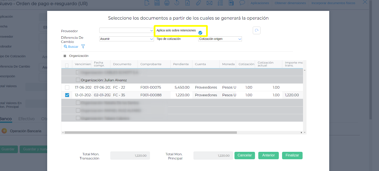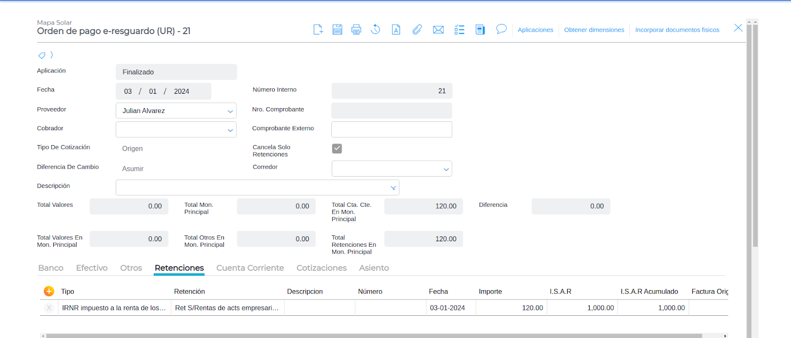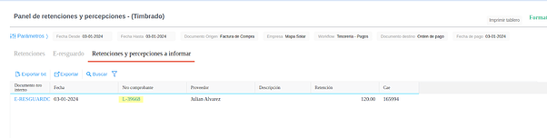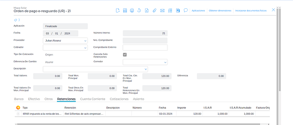En el siguiente ejemplo solo se cancelan las retenciones mediante el tipo de documento orden de pago e-resguardo.
