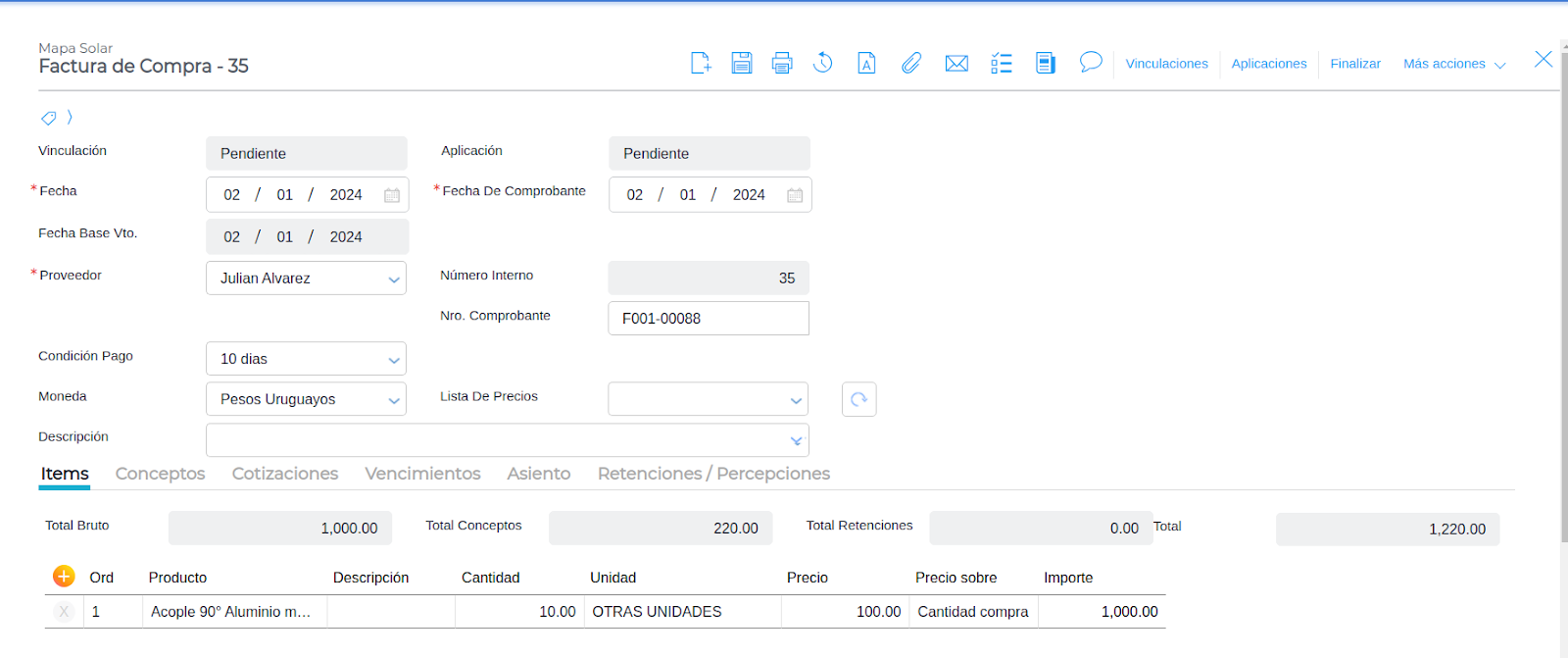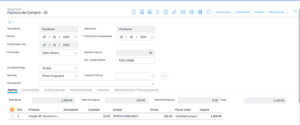 Se debe cargar una factura de compra al proveedor configurado con las retenciones, por la configuración de la retención no se visualizarán en la factura.
