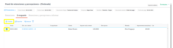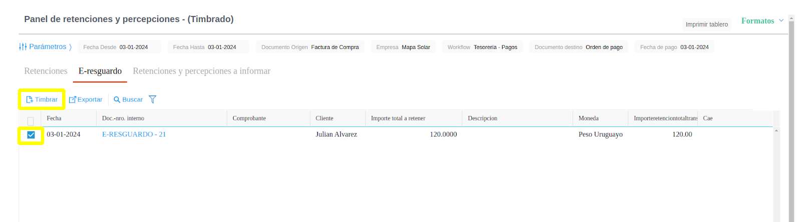 Presionar la/s órdenes de pago e-resguardo que se quieren informar a DGI y presionar el botón Timbrar
