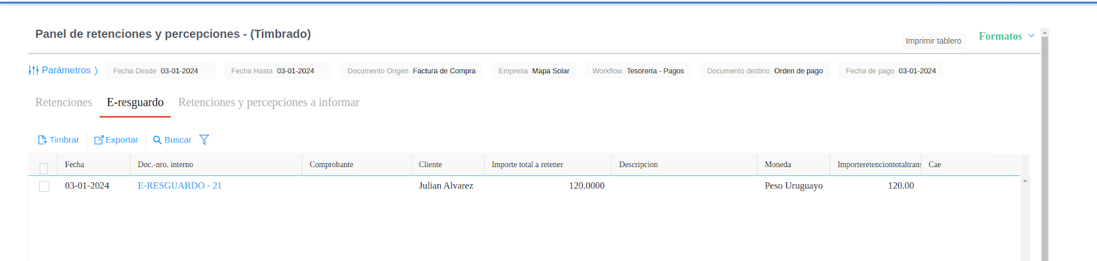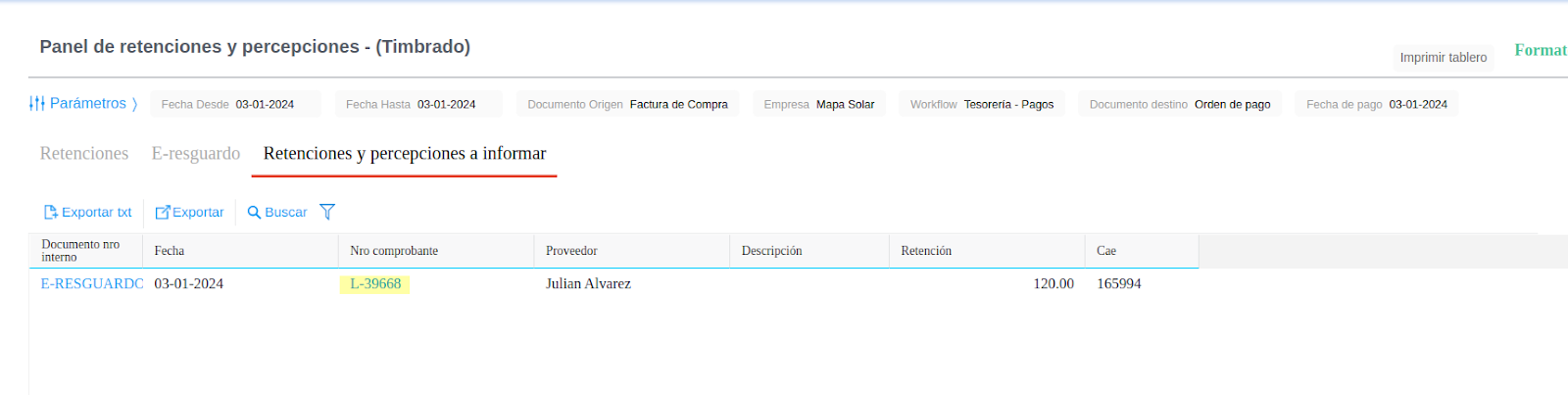 Una vez que enviada y aprobada por biller desaparece de la solapa E-resguardo y se encuentra en la solapa Retenciones y percepciones a informar con el número de cae asignado por biller
