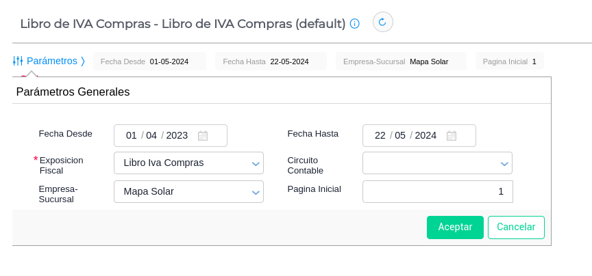 Menú → Gestión Empresarial → Impuestos →IVA → Libro Iva Compras