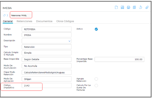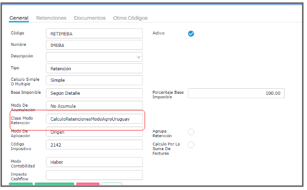 La configuración de la retención requiere la Clase Modo Retención: CalculoRetencionesModoAgroUruguay