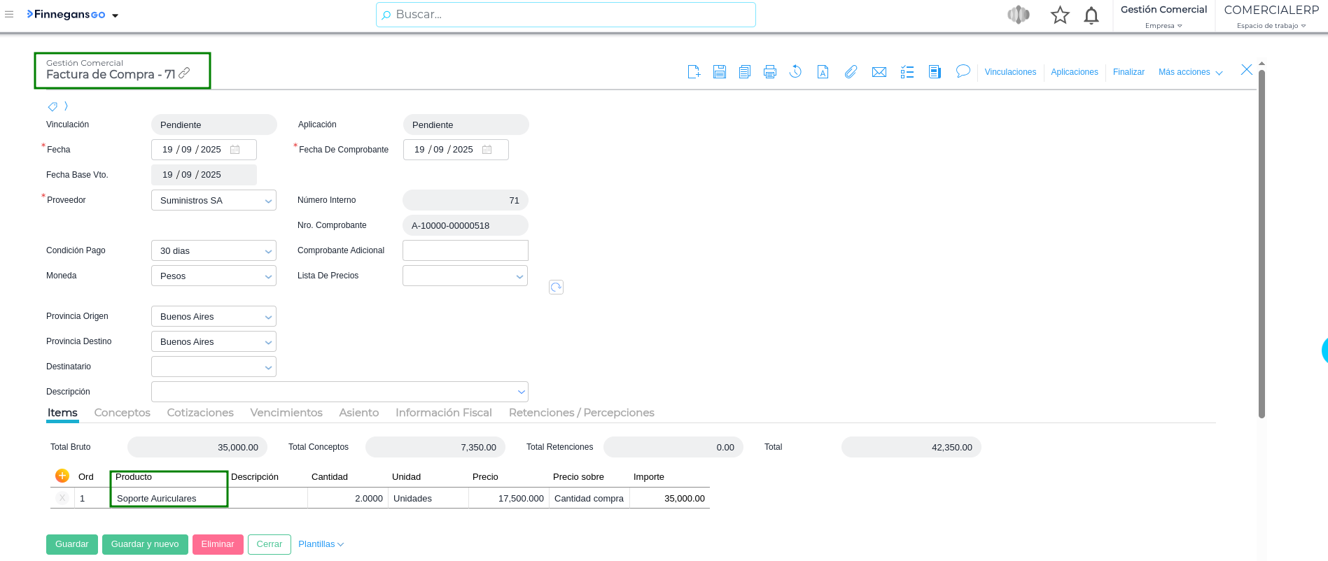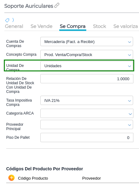 Si existen transacciones previas, se mostrará el siguiente mensaje: “No se permite modificar la unidad de compra “unidades” para el producto Soporte de Auriculares porque existen operaciones generadas con anterioridad”.