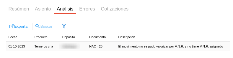 Si desde la solapa resumen ingresamos a la fila correspondiente a la Categoría de hacienda / Depósito que indica el aviso veremos que el movimiento que no se puede valorizar es un nacimiento.