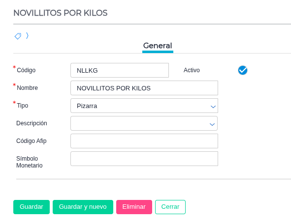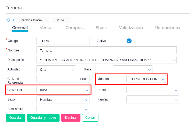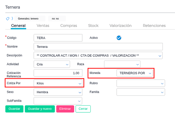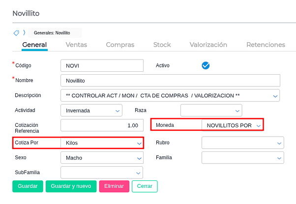 Las categorías deben tener una moneda asignada. Hay que controlar que el campo “Cotiza por” sea coherente con la moneda seleccionada. Es decir si la categoría cotiza por kilos no puedo indicar una moneda donde la cotización sea por cabeza.
