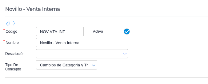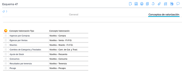 Los conceptos vienen configurados por default, pero en caso de requerir algún tipo de valorización particular para los movimientos de hacienda, como son los traslados y cambios de categoría por venta interna, o cambiar las cuentas se define en el maestro de conceptos de valorización: