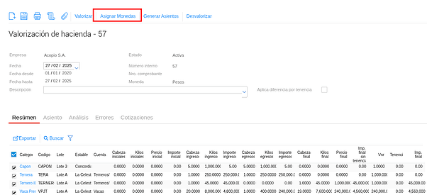 Se seleccionan todos los ítems y se hace clic en “Asignar Monedas”, esto da un valor a cada uno de los movimientos según la cotización de la moneda asociada a la categoría.
