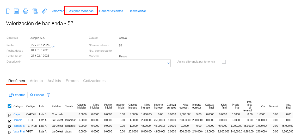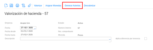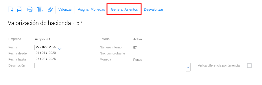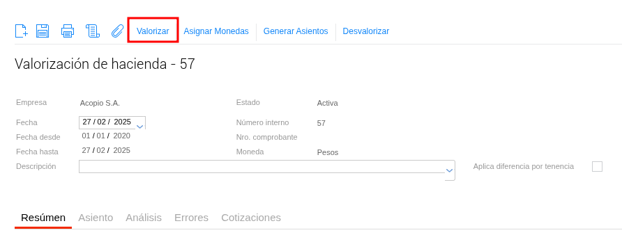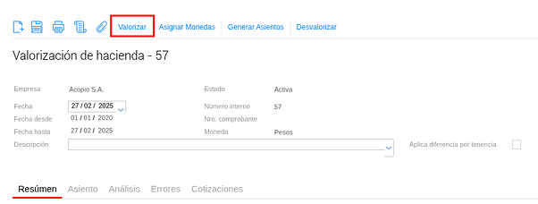 Para realizar la valorización, es necesario tener movimientos de hacienda previamente grabados. Para más información, ver la siguiente entrada: