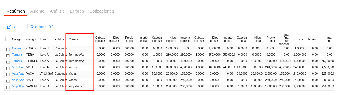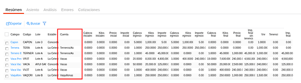 La columna “cuenta” informa la cuenta configurada en los conceptos de tenencia para cada una de las categorías de hacienda