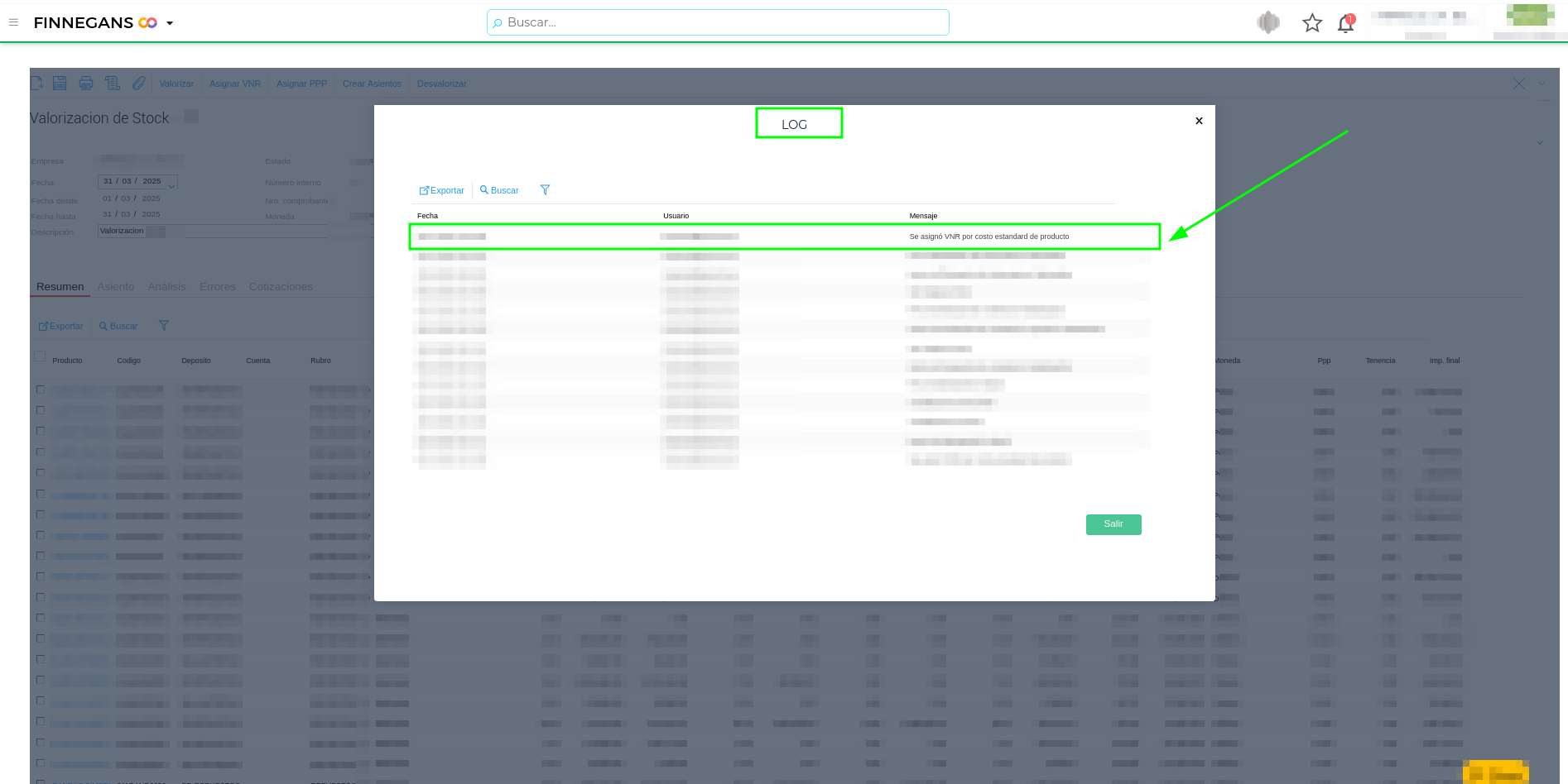 - Verifica nuevamente el Log para asegurarte de que ahora se haya asignado el VNR por costo estándar del producto.