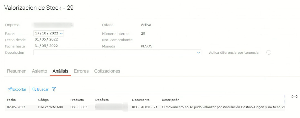 Error al realizar una Valorización de Stock: “El movimiento no se pudo valorizar por Vinculación Destino-Origen”