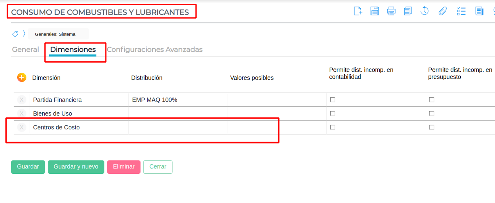 - Una vez completa la distribución de la dimensión Centro de costo, guardar.