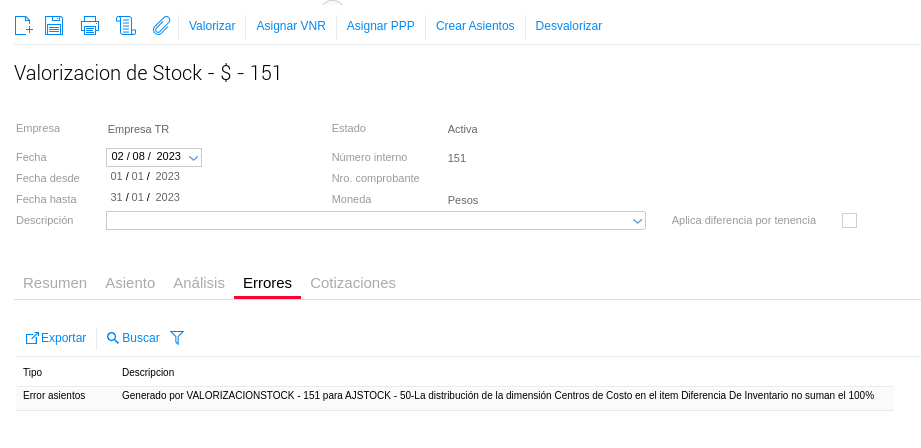 Al generar una valorización de stock y crear los asientos correspondientes, el sistema arroja el siguiente aviso: