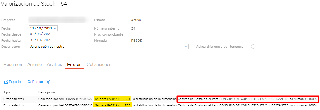 Al generar una valorización en la solapa Errores arroja aviso de que “La dimensión Centro de Costo en el item no suman el 100%”