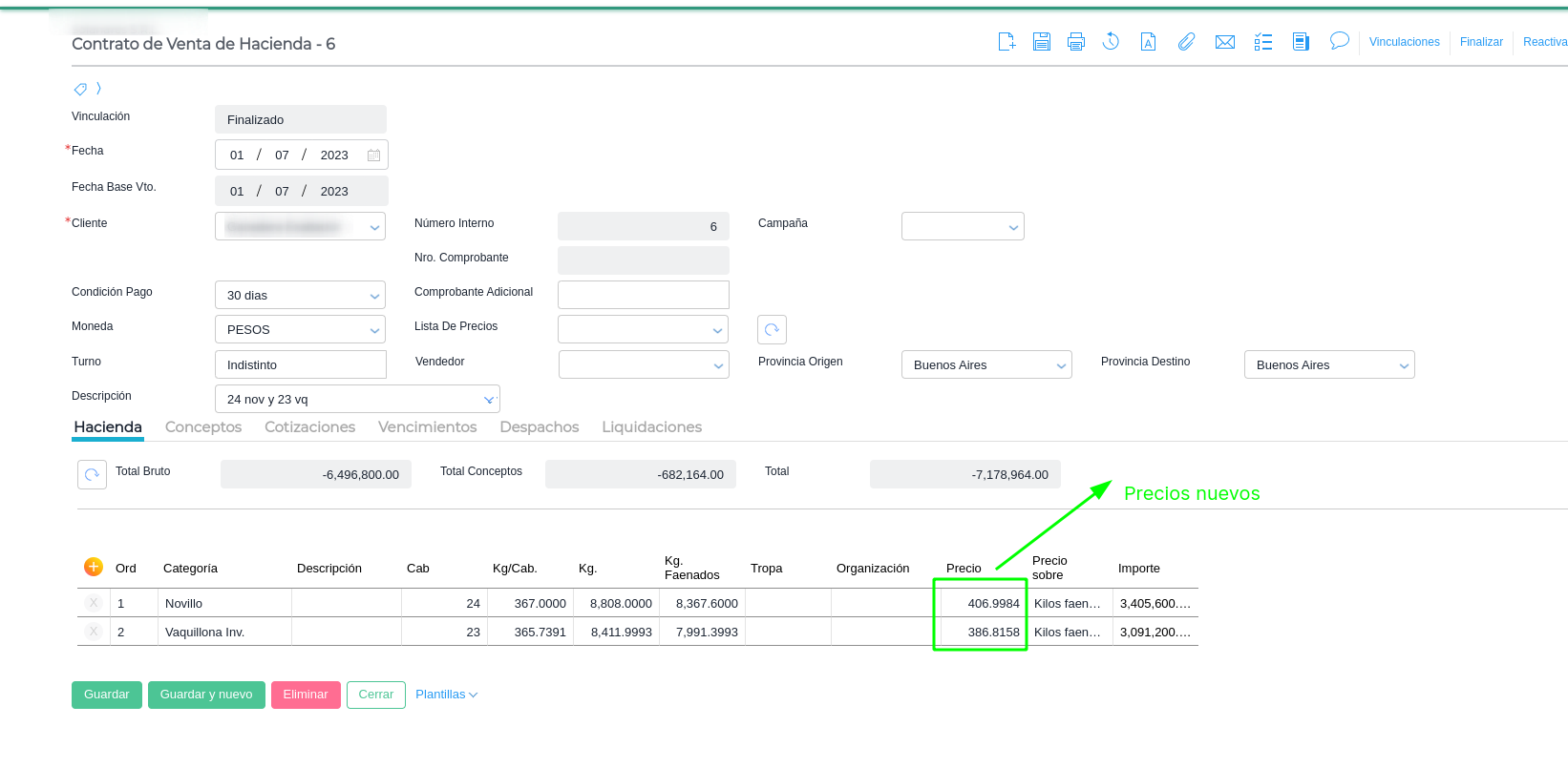 Pero si abrimos la vinculación desde el contrato de venta de hacienda, se ven los precios antiguos: