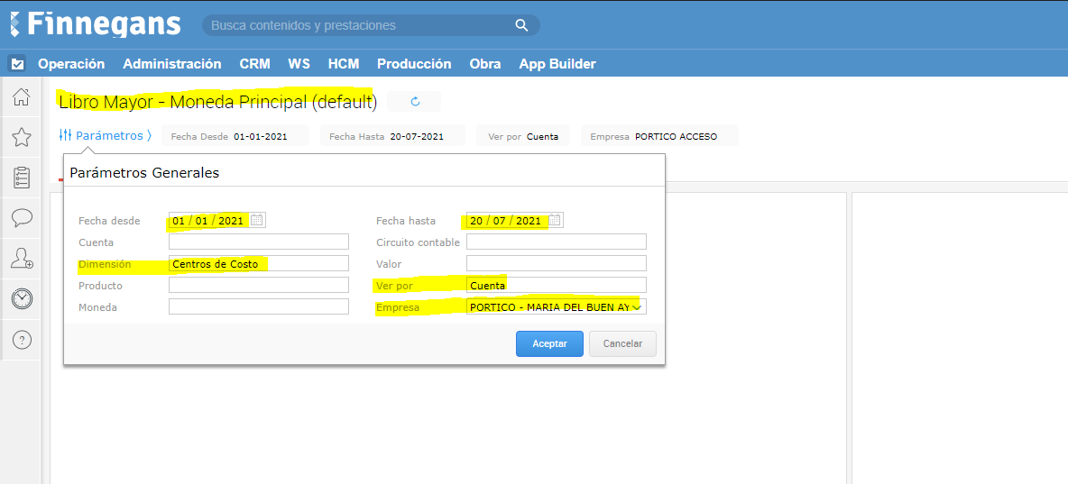 Se debe configurar el informe de Libro Mayor - Moneda Principal para que muestre la dimensión deseada
