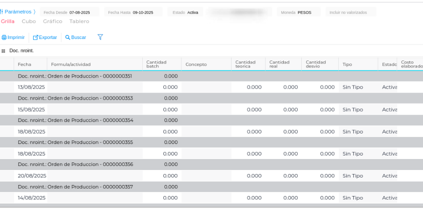 Al emitir el informe “Análisis de Órdenes de Producción”, las columnas “Cantidad Real” y “Cantidad Destino” aparecen vacías (en cero) en la mayoría de las órdenes de producción.