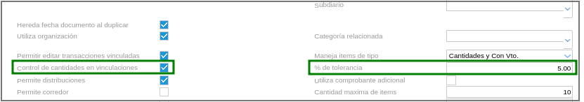 Para transacciones creadas mediante el asistente, cuando en el Maestro de Tipos de Documento el documento origen tiene activada la opción “Control de Cantidades en Vinculaciones”, el campo “% de tolerancia” está definido con un valor y, además, en el Maestro de Workflows la relación se configura con la opción “Edición Restringida” establecida en “Controla máximo”, esta última configuración prevalece sobre el valor definido en el campo “% de tolerancia”.